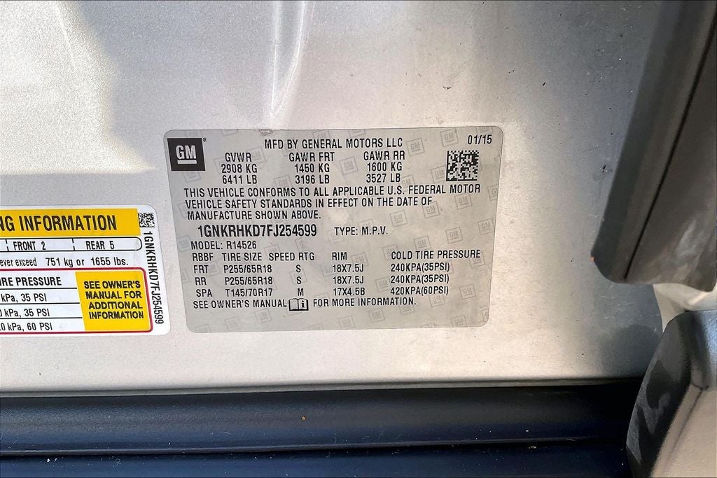 Front License Plate Bracket Mounting Package, Preferred Equipment Group 2LT (8-Way Power Driver Seat w/Power Lumbar, Auto-Dimming Inside Rear-View Mirror, Bluetooth® For Phone, Body-Color Bodyside Moldings, Bose Premium 10-Speaker Audio System Feature, Enhanced Driver Information Center, Front Fog Lamps, Front Row Side-Impact Air Bags, Heated Driver & Front Passenger Seats, Heated Power-Adjustable Body-Color Outside Mirrors, Interior Wood Grain Center Stack & Interior Trim, Leather-Wrapped Steering Wheel, Rear Audio System Controls, Rear Park Assist, Rear Power Liftgate, Remote Vehicle Start, Tri-Zone Automatic Climate Control, and Universal Home Remote), 10 Speakers, 3.16 Axle Ratio, 3rd row seats: split-bench, 4-Wheel Disc Brakes, 7-Passenger Seating (2-2-3 Seating Configuration), ABS brakes, Air Conditioning, Alloy wheels, AM/FM radio: SiriusXM, Auto-dimming door mirrors, Auto-dimming Rear-View mirror, Automatic temperature control, Bodyside moldings, Brake assist, Bumpers: body-color, CD player, Compass, Delay-off headlights, Driver door bin, Driver vanity mirror, Dual front impact airbags, Dual front side impact airbags, Electronic Stability Control, Emergency communication system: OnStar Directions & Connections, Exterior Parking Camera Rear, Four wheel independent suspension, Front anti-roll bar, Front Bucket Seats, Front Center Armrest w/Storage, Front dual zone A/C, Front fog lights, Front reading lights, Fully automatic headlights, Garage door transmitter, Heated door mirrors, Heated front seats, Illuminated entry, Low tire pressure warning, Occupant sensing airbag, Outside temperature display, Overhead airbag, Panic alarm, Passenger door bin, Passenger vanity mirror, Power door mirrors, Power driver seat, Power Liftgate, Power steering, Power windows, Premium audio system: Chevrolet MyLink, Premium Cloth Seat Trim, Radio data system, Radio: Chevrolet MyLink, Rear air conditioning, Rear anti-roll bar, Rear audio controls, Rear reading lights, Rear window defroster, Rear window wiper, Remote keyless entry, Roof rack: rails only, Security system, SiriusXM Satellite Radio, Speed control, Spoiler, Steering wheel mounted audio controls, Tachometer, Telescoping steering wheel, Tilt steering wheel, Traction control, Trip computer, Turn signal indicator mirrors, Variably intermittent wipers, Voltmeter, and Wheels: 18 x 7.5 Machined (4)