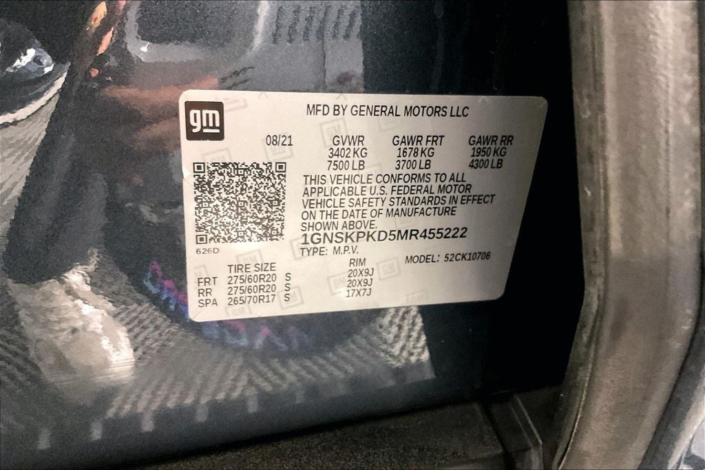 License Plate Front Mounting Package, Preferred Equipment Group 2Z7 (Remote Start, 1st & 2nd Row Color-Keyed Carpeted Floor Mats, 2 USB Data Ports, 2-Speed Active Electronic AutoTrac Transfer Case, Auto-Dimming Inside Rear-View Mirror, Black Tubular Assist Steps, Bright Front & Rear Door Sill Plates, Color-Keyed Carpeting Floor Covering, Driver & Front Outboard Passenger Airbags, Floor Console w/Storage Area, Front High-Approach Angle Fascia, Hands-Free Rear Power Programmable Liftgate, HD Radio, Hill Descent Control, Infotainment Display, Leather-Wrapped Steering Wheel, LED Daytime Running Lamps, Memory Settings for Driver, Red Horizontal-Mounted Recovery Hooks, SiriusXM Radio w/360L, and Universal Home Remote), 10-Way Power Driver & Passenger Seat Adjusters, 4-Wheel Disc Brakes, 9 Speakers, ABS brakes, Air Conditioning, AM/FM radio: SiriusXM with 360L, Apple CarPlay/Android Auto, Auto High-beam Headlights, Automatic temperature control, Bose 9-Speaker Stereo Audio System Feature, Brake assist, Delay-off headlights, Electronic Stability Control, Front Bucket Seats, Leather steering wheel, Low tire pressure warning, Panic alarm, Power driver seat, Power Liftgate, Power steering, Power windows, Premium Smooth Ride Suspension, Remote keyless entry, Security system, Speed control, Speed-sensing steering, Traction control, Variably intermittent wipers, 2nd Row Manual Bucket Seats, 3.23 Rear Axle Ratio, 3rd row seats: split-bench, Alloy wheels, Auto-dimming Rear-View mirror, Bumpers: body-color, Compass, Driver door bin, Driver vanity mirror, Dual front impact airbags, Dual front side impact airbags, Dual-Pane Power Panoramic Sunroof, Emergency communication system: OnStar and Chevrolet connected services capable, Four wheel independent suspension, Front anti-roll bar, Front Center Armrest, Front dual zone A/C, Front High-Back Reclining Bucket Seats, Front reading lights, Fully automatic headlights, Garage door transmitter, Heated door mirrors, Heated Driver & Front Passenger Seats, Heated front seats, Illuminated entry, Leather Seat Trim, Memory seat, Not Equipped w/Automatic Stop/Start, Not Equipped w/Steering Column Lock, Occupant sensing airbag, Outside temperature display, Overhead airbag, Overhead console,