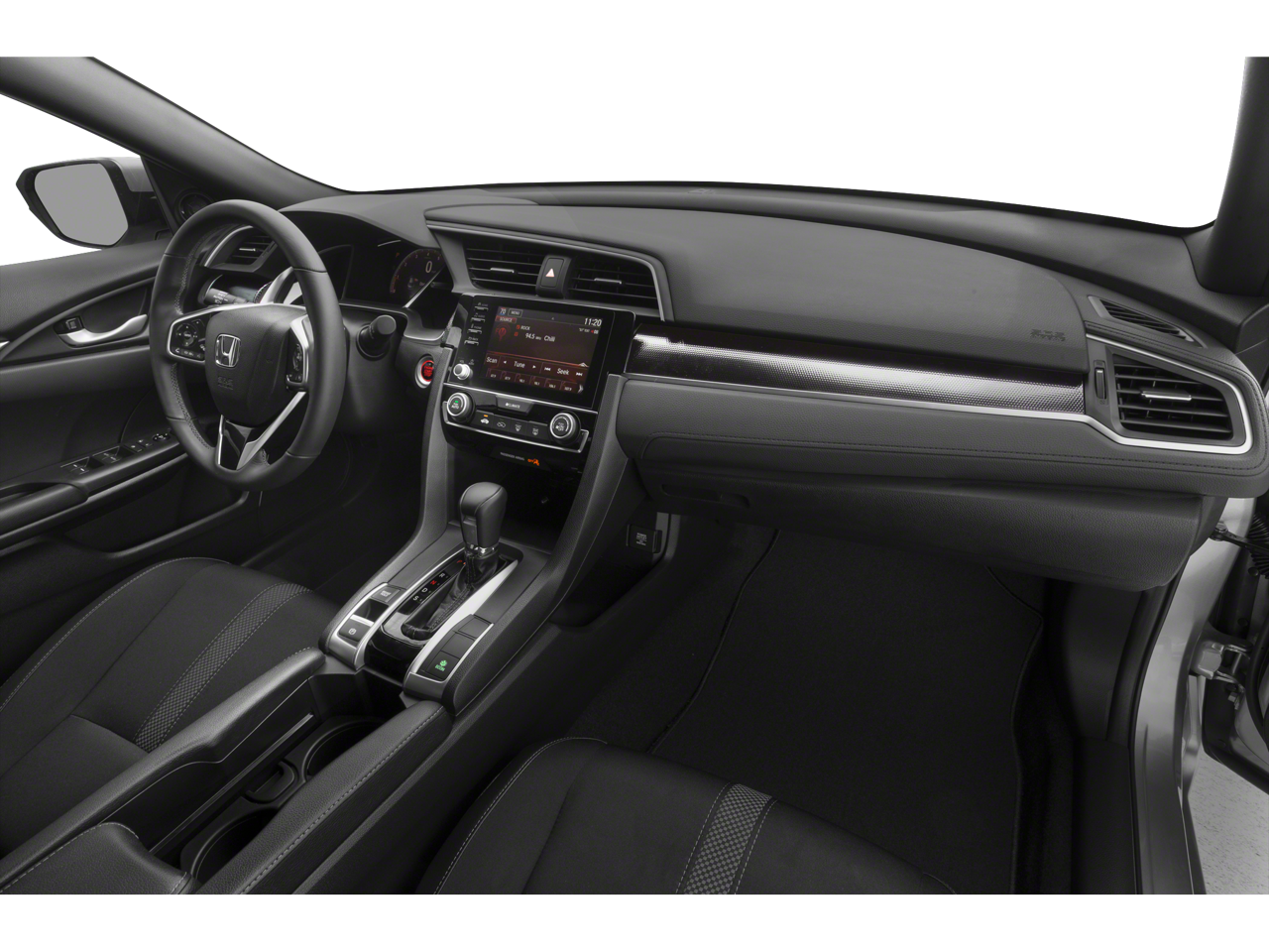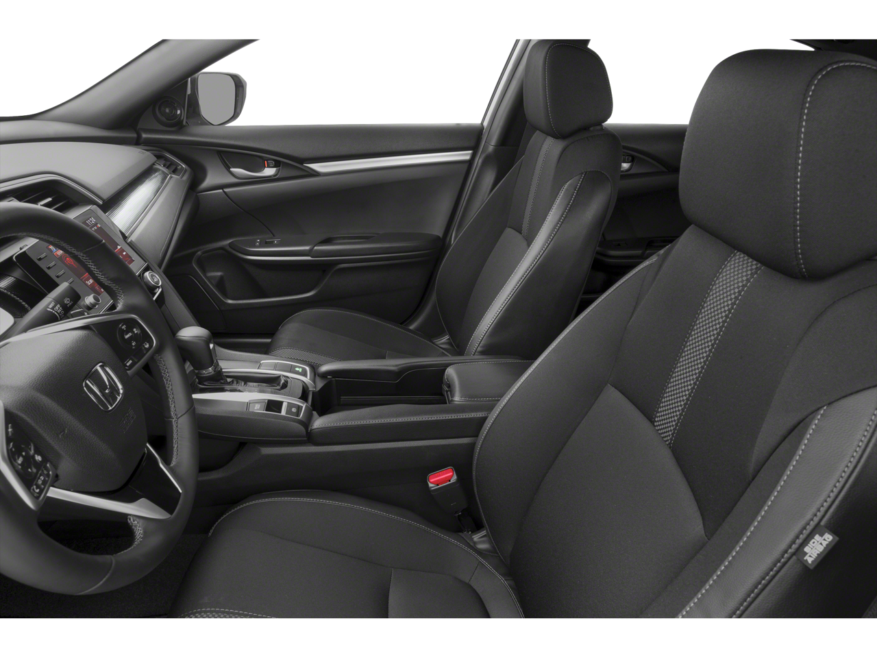 4-Wheel Disc Brakes, 8 Speakers, ABS brakes, Adaptive Cruise Control: Adaptive Cruise Control (ACC) with Low-Speed Follow, Air Conditioning, Alloy wheels, AM/FM radio, Apple CarPlay/Android Auto, Auto High-beam Headlights, Automatic temperature control, Brake assist, Bumpers: body-color, Cloth Seat Trim, Delay-off headlights, Driver door bin, Driver vanity mirror, Dual front impact airbags, Dual front side impact airbags, Electronic Stability Control, Emergency communication system: HondaLink, Exterior Parking Camera Rear, Forward collision: Collision Mitigation Braking System (CMBS) + FCW mitigation, Four wheel independent suspension, Front anti-roll bar, Front Bucket Seats, Front Center Armrest, Front fog lights, Front reading lights, Fully automatic headlights, Illuminated entry, Lane departure: Lane Keeping Assist System (LKAS) active, Leather Shift Knob, Low tire pressure warning, Occupant sensing airbag, Outside temperature display, Overhead airbag, Panic alarm, Passenger door bin, Passenger vanity mirror, Power door mirrors, Power steering, Power windows, Radio data system, Radio: 180-Watt AM/FM Audio System, Rear anti-roll bar, Rear window defroster, Remote keyless entry, Security system, Speed control, Speed-sensing steering, Split folding rear seat, Spoiler, Steering wheel mounted audio controls, Tachometer, Telescoping steering wheel, Tilt steering wheel, Traction control, Trip computer, and Wheels: 18 Alloy w/Gloss Black Inserts.