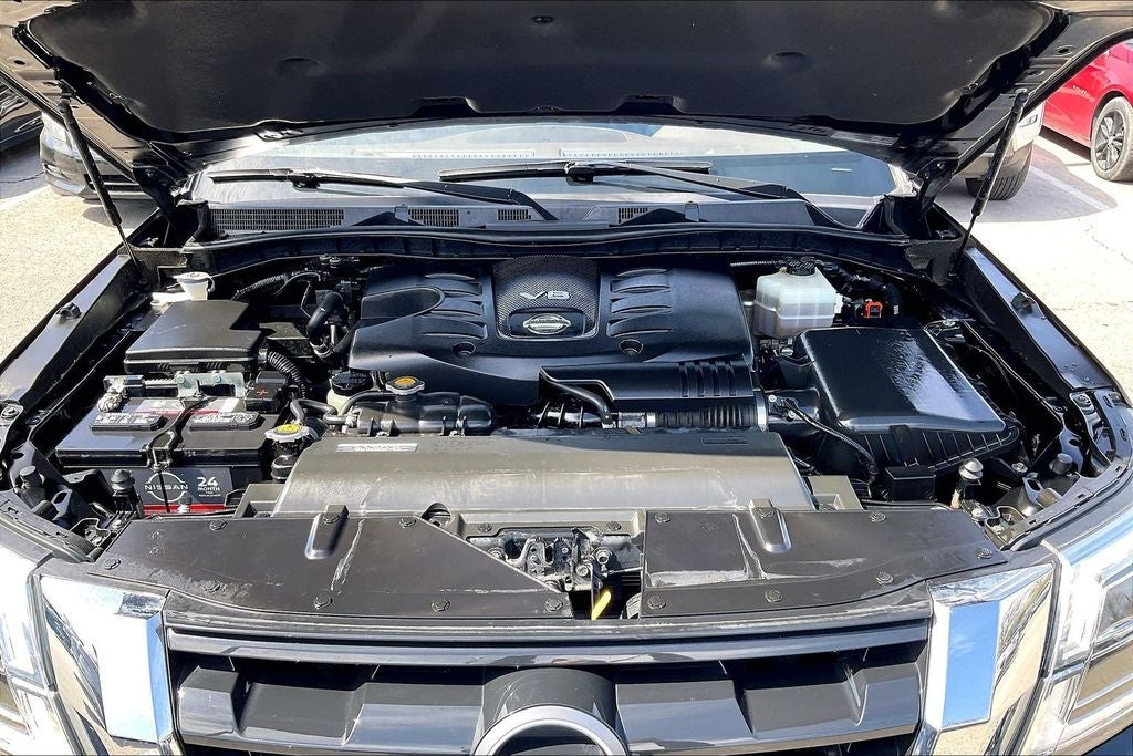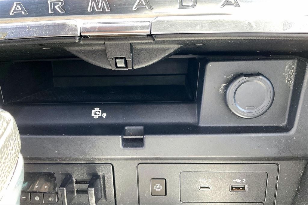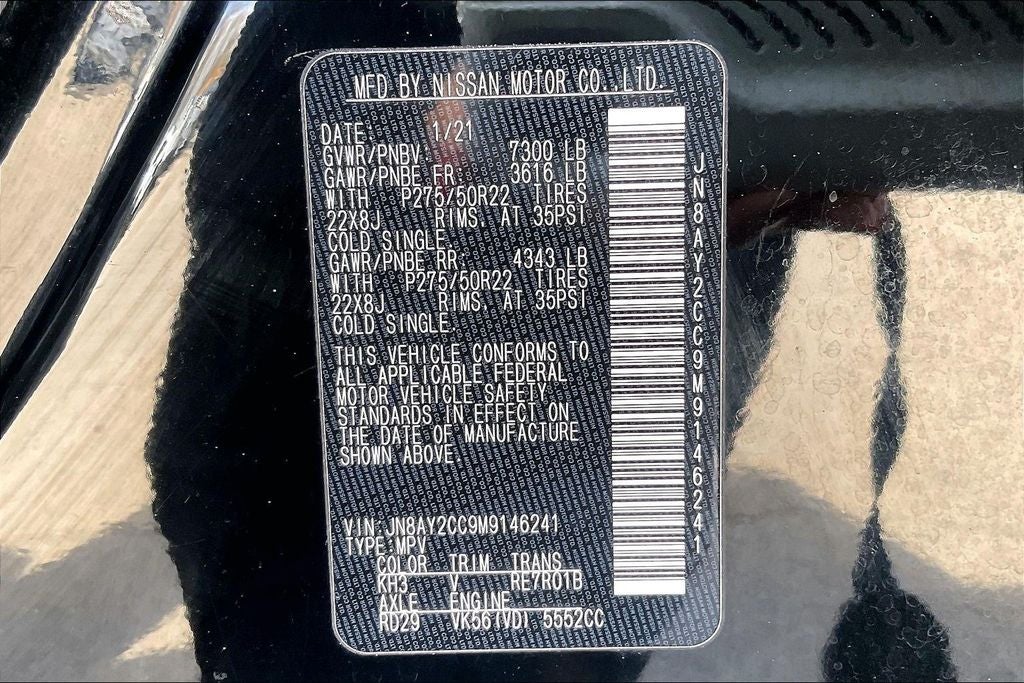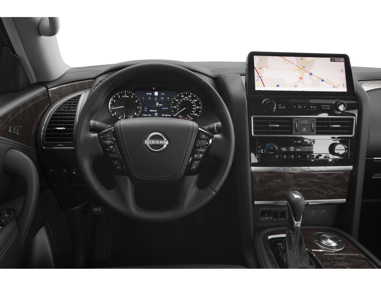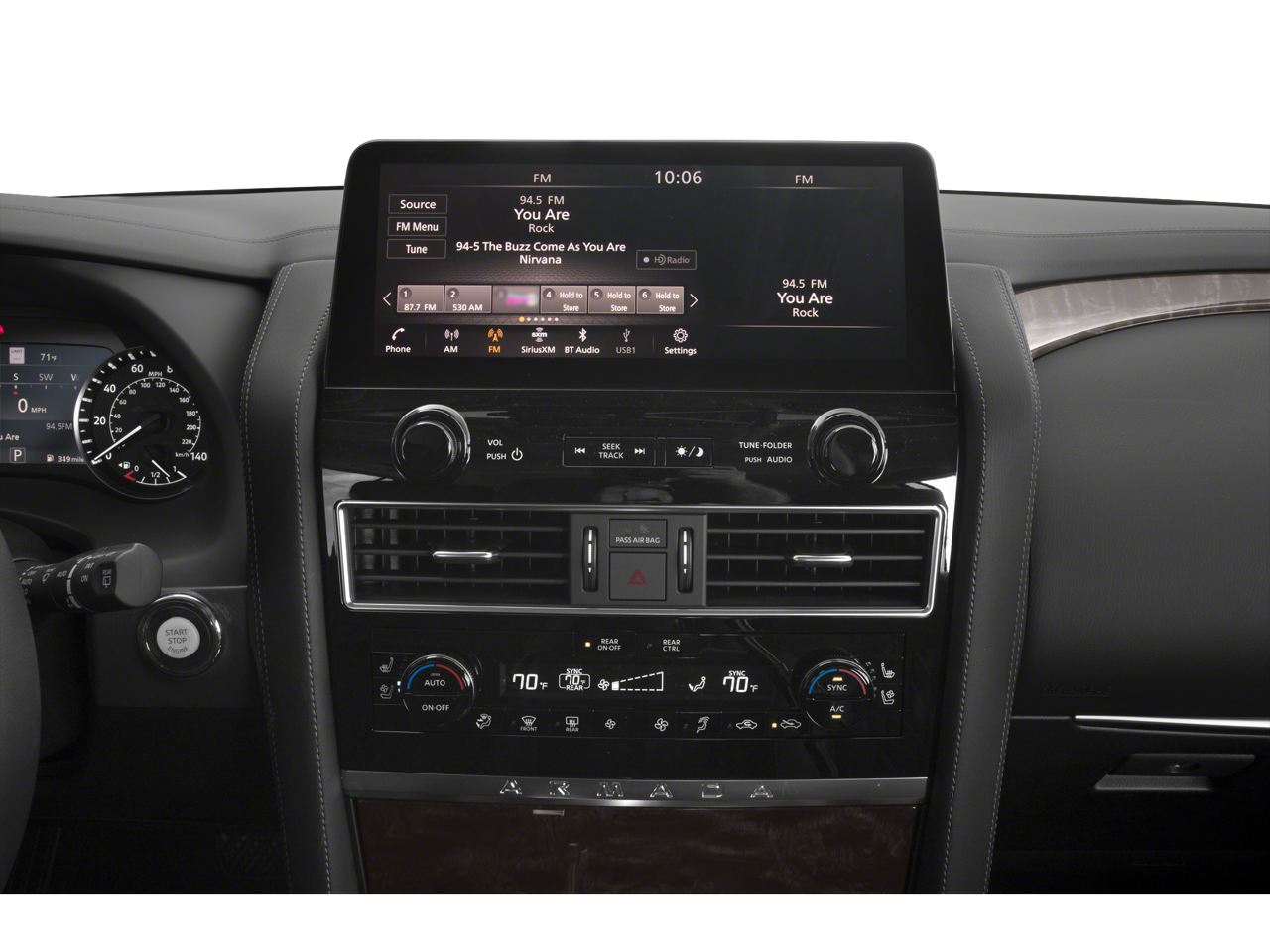 13 Speakers, 2.94 Axle Ratio, 3rd Row Carpeted Floor Mats - Bench Seat, 3rd row seats: split-bench, 4-Wheel Disc Brakes, A/V remote, ABS brakes, Air Conditioning, Alloy wheels, AM/FM radio: SiriusXM, Anti-whiplash front head restraints, Auto High-beam Headlights, Auto tilt-away steering wheel, Auto-dimming door mirrors, Auto-dimming Rear-View mirror, Auto-leveling suspension, Automatic temperature control, Brake assist, Bumpers: body-color, Climate-Controlled Front Bucket Seats, Delay-off headlights, Driver door bin, Driver vanity mirror, Dual front impact airbags, Dual front side impact airbags, Electronic Stability Control, Emergency communication system: NissanConnect Services, Exterior Parking Camera Rear, Four wheel independent suspension, Front anti-roll bar, Front Bucket Seats, Front Center Armrest, Front dual zone A/C, Front fog lights, Front reading lights, Fully automatic headlights, Garage door transmitter: HomeLink, Headphones, Heated door mirrors, Heated front seats, Heated rear seats, Heated steering wheel, Illuminated entry, Leather Shift Knob, Low tire pressure warning, Memory seat, Navigation System, NissanConnect featuring Apple CarPlay and Android Auto, Occupant sensing airbag, Outside temperature display, Overhead airbag, Overhead console, Panic alarm, Passenger door bin, Passenger vanity mirror, Power door mirrors, Power driver seat, Power Liftgate, Power moonroof, Power passenger seat, Power steering, Power windows, Quilted Leather Seat Trim, Radio: NissanConnect w/SiriusXM, Rain sensing wipers, Rear air conditioning, Rear anti-roll bar, Rear reading lights, Rear seat center armrest, Rear window defroster, Rear window wiper, Reclining 3rd row seat, Remote keyless entry, Security system, Speed control, Speed-sensing steering, Speed-Sensitive Wipers, Split folding rear seat, Spoiler, Steering wheel memory, Steering wheel mounted audio controls, Tachometer, Telescoping steering wheel, Tilt steering wheel, Traction control, Trip computer, Turn signal indicator mirrors, Variably intermittent wipers, Ventilated front seats, Voltmeter, and Wheels: 22 Machine-Faced w/Tinted Clear Coat.
