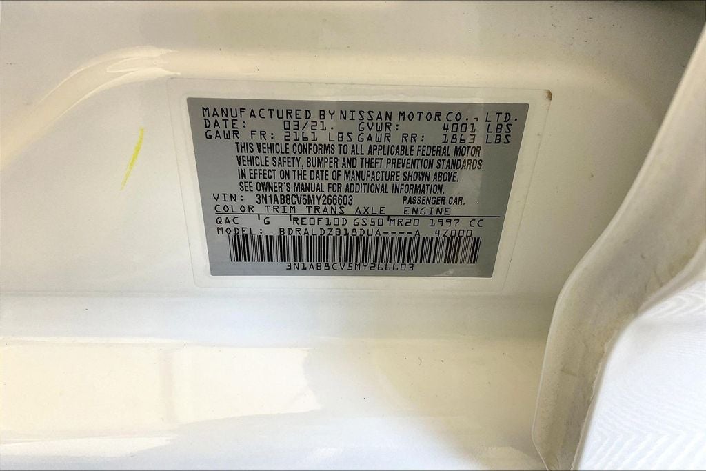 Sentra SV, 4D Sedan, 2.0L DOHC, CVT with Xtronic, FWD, Aspen White Tricoat, Charcoal Cloth, 4-Wheel Disc Brakes, 6 Speakers, ABS brakes, Air Conditioning, AM/FM radio: SiriusXM, Auto High-beam Headlights, Automatic temperature control, Brake assist, Delay-off headlights, Electronic Stability Control, Four wheel independent suspension, Front Bucket Seats, Low tire pressure warning, Panic alarm, Power windows, Rear Parking Sensors, Remote keyless entry, Speed control, Speed-sensing steering, Variably intermittent wipers, 16 Alloy Wheels, Alloy wheels, Body Colored Splash Guards (4-Piece), Bumpers: body-color, Carpeted Floor Mats w/Trunk Mat, Clear Rear Bumper Protector, Door Sill Plates, Driver door bin, Driver vanity mirror, Dual front impact airbags, Dual front side impact airbags, Front anti-roll bar, Front Center Armrest, Front dual zone A/C, Front reading lights, Fully automatic headlights, Heated door mirrors, Illuminated entry, Knee airbag, NissanConnect featuring Apple CarPlay and Android Auto, Occupant sensing airbag, Outside temperature display, Overhead airbag, Overhead console, Passenger door bin, Passenger vanity mirror, Power door mirrors, Power steering, Radio data system, Radio: AM/FM w/RDS/MP3/Aux-In, Rear anti-roll bar, Rear seat center armrest, Rear side impact airbag, Rear window defroster, Security system, Split folding rear seat, Steering wheel mounted audio controls, Tachometer, Telescoping steering wheel, Tilt steering wheel, Traction control, Trip computer, and Upgraded Cloth Seat Trim.