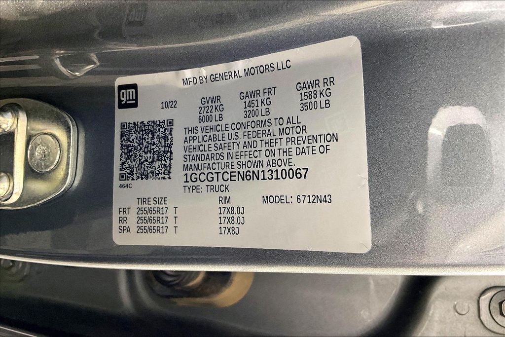 Heavy-Duty Trailering Package, LT Convenience Package (Front Fog Lamps, Manual Rear-Sliding Window, Rear-Window Electric Defogger, and Remote Vehicle Starter System), Preferred Equipment Group 4LT (Enhanced Driver Instrument Information Display and Rear Vision Camera), 4-Wheel Disc Brakes, 6 Speakers, 6-Speaker Audio System Feature, ABS brakes, Air Conditioning, Apple CarPlay/Android Auto, Cloth Seat Trim, Delay-off headlights, Driver 6-Way Power Seat Adjuster, Electronic Stability Control, Exterior Parking Camera Rear, Front Bucket Seats, Front reading lights, Low tire pressure warning, Power driver seat, Radio: Chevrolet Infotainment 3 System, Remote keyless entry, Security system, SiriusXM Radio, Speed control, Traction control, Variably intermittent wipers, 1st & 2nd Row All-Weather Floor Liner (LPO), 3.42 Rear Axle Ratio, Alloy wheels, AM/FM radio: SiriusXM, Auto-dimming Rear-View mirror, Automatic Locking Rear Differential, Black Spray-On Bedliner w/Chevrolet Logo, Bumpers: body-color, Cargo Area Lamps (LPO), Compass, Driver door bin, Driver vanity mirror, Dual front impact airbags, Dual front side impact airbags, Front anti-roll bar, Front Center Armrest, Front License Plate Kit, Front wheel independent suspension, Fully automatic headlights, Illuminated entry, Occupant sensing airbag, Outside Heated Power-Adjustable Body-Color Mirrors, Outside temperature display, Overhead airbag, Overhead console, Panic alarm, Passenger door bin, Passenger vanity mirror, Power door mirrors, Power steering, Power windows, Premium audio system: Chevrolet Infotainment 3, Radio data system, Rear reading lights, Rear seat center armrest, Rear step bumper, Speed-sensing steering, Steering wheel mounted audio controls, Tachometer, Telescoping steering wheel, Tilt steering wheel, Trip computer, and Wheels: 17 x 8 Blade Silver Metallic Cast Alloy.