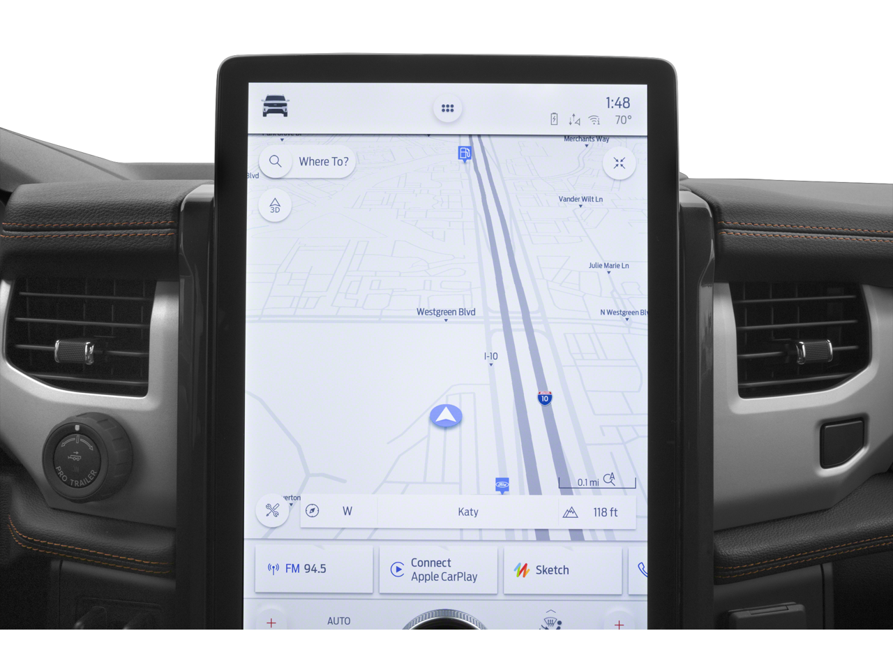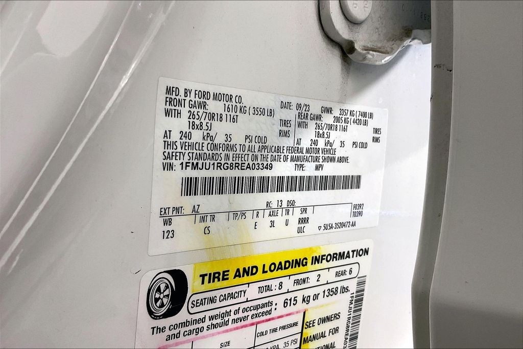 Equipment Group 500A Standard Package, 2nd Row Power-Folding 40/20/40 Leather Bench Seat, 4-Wheel Disc Brakes, 6 Speakers, ABS brakes, Air Conditioning, AM/FM radio: SiriusXM with 360L, Auto High-beam Headlights, Auto-dimming door mirrors, Automatic temperature control, Brake assist, Bumpers: body-color, Delay-off headlights, Electronic Stability Control, Exterior Parking Camera Rear, Four wheel independent suspension, Front Bucket Seats, Front dual zone A/C, Low tire pressure warning, Panoramic Vista Roof, Power driver seat, Power Liftgate, Power windows, Radio data system, Remote keyless entry, Speed-sensing steering, Variably intermittent wipers, 3rd row seats: split-bench, Adjustable pedals, Alloy wheels, Auto-dimming Rear-View mirror, Compass, ControlTrac w/3.73 Axle Ratio, Driver door bin, Driver vanity mirror, Dual front impact airbags, Dual front side impact airbags, Emergency communication system: SYNC 4 911 Assist, Front anti-roll bar, Front Center Armrest, Front fog lights, Front reading lights, Fully automatic headlights, Garage door transmitter, Heated & Vent Cloth/Vinyl Front Captain's Chairs, Heated door mirrors, Heated front seats, Heated steering wheel, Illuminated entry, Leather steering wheel, Memory seat, Navigation system: Connected Navigation, Occupant sensing airbag, Outside temperature display, Overhead airbag, Overhead console, Panic alarm, Passenger door bin, Passenger vanity mirror, Pedal memory, Power door mirrors, Power passenger seat, Power steering, Radio: AM/FM Stereo w/MP3 Capable, Rear air conditioning, Rear anti-roll bar, Rear reading lights, Rear window defroster, Rear window wiper, Reclining 3rd row seat, Security system, SiriusXM w/360L, Speed control, Speed-Sensitive Wipers, Split folding rear seat, Spoiler, Steering wheel memory, Steering wheel mounted audio controls, SYNC 4 w/Enhanced Voice Recognition, Tachometer, Telescoping steering wheel, Tilt steering wheel, Traction control, Trip computer, Turn signal indicator mirrors, Ventilated front seats, Voltmeter, and Wheels: 18 Ebony-Painted.