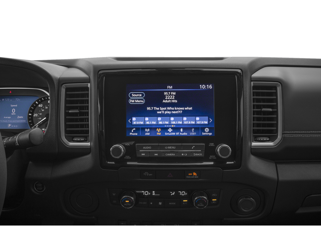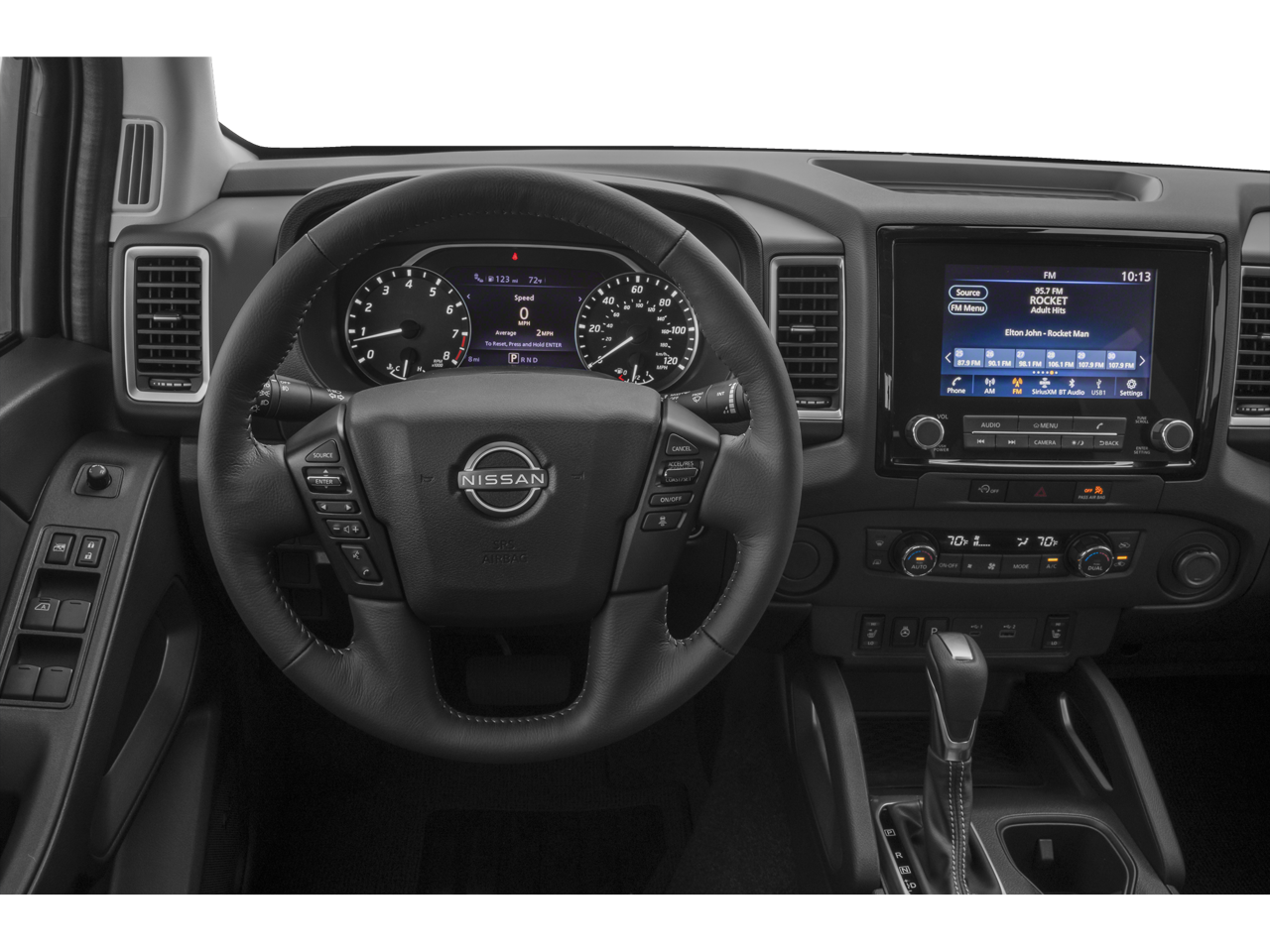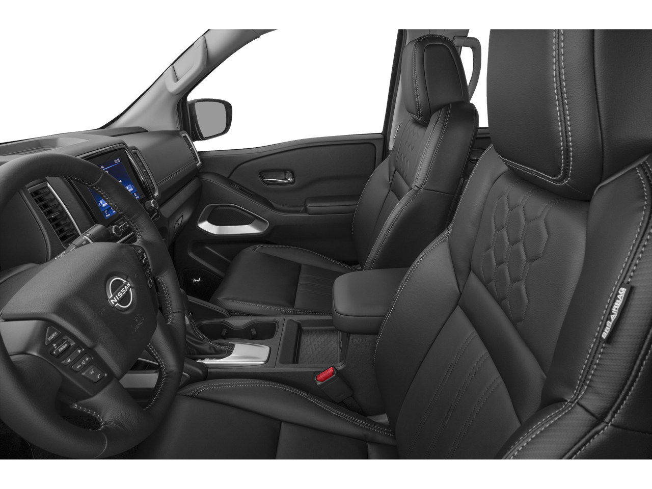 Bed Access Package, Graphics Package (Black Frontier Logo Side Graphic, Black Hood Graphic, and Black Tailgate Logo Insert), Technology Package (Blind Spot Warning, High Beam Assist (HBA), Intelligent Cruise Control, Lane Departure Warning System, Rear Automatic Braking (RAB), Rear Cross Traffic Alert (RCTA), and Rear Sonar System), Tow Package (T11), 4-Wheel Disc Brakes, ABS brakes, Air Conditioning, AM/FM radio: SiriusXM, Apple CarPlay/Android Auto, Automatic temperature control, Brake assist, Delay-off headlights, Electronic Stability Control, Front Bucket Seats, Low tire pressure warning, Panic alarm, Power driver seat, Power steering, Power windows, Security system, Speed control, Speed-sensing steering, Traction control, Variably intermittent wipers, 10 Speakers, 17 Machined & Painted Alloy Wheels, 3.692 Axle Ratio, Alloy wheels, Anti-whiplash front head restraints, Bumpers: body-color, Carpeted Floor Mats, Driver door bin, Driver vanity mirror, Dual front impact airbags, Dual front side impact airbags, Electronic Tailgate Lock, Fender Premium Audio System w/10 Speakers, Front anti-roll bar, Front Center Armrest, Front dual zone A/C, Front fog lights, Front reading lights, Front wheel independent suspension, Fully automatic headlights, Garage door transmitter: HomeLink, Heated door mirrors, Heated Front Bucket Seats, Heated front seats, Heated steering wheel, Illuminated entry, Knee airbag, Leather Shift Knob, Leather steering wheel, Leather-Appointed Seat Trim, Nissan Tailgate Audio by Kicker w/Utili-Track Brkt, Occupant sensing airbag, Off-Road Style Step Rails, Overhead airbag, Overhead console, Passenger door bin, Passenger vanity mirror, Power door mirrors, Power moonroof, Radio data system, Radio: SXM/AM/FM/AUX/USB Audio System, Rear anti-roll bar, Rear seat center armrest, Rear side impact airbag, Rear step bumper, Remote keyless entry, Splash Guards, Split folding rear seat, Sport Bar (R92), Steering wheel mounted audio controls, Tachometer, Tilt steering wheel, Trip computer, USB Charging Cable Kit, Voltmeter, and Wireless Charger.