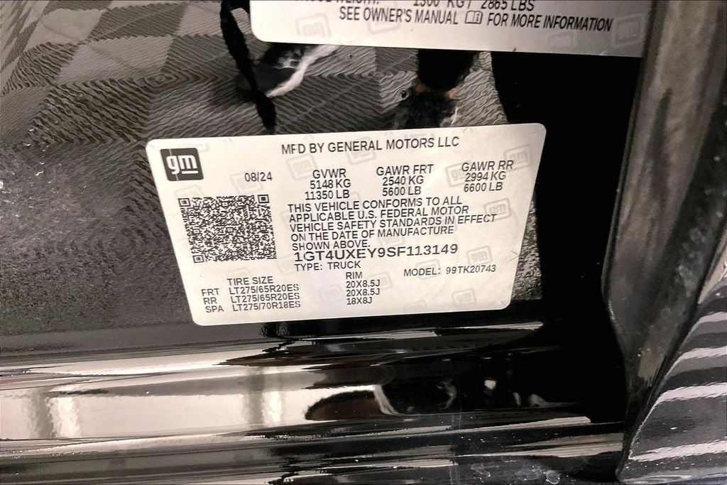 GMC Protection Package (LPO) (All-Weather Floor Liners (LPO) and Black Front & Rear Molded Splash Guards (LPO)), Gooseneck/5th Wheel Prep Package, Preferred Equipment Group 5SB (120-Volt Bed Mounted Power Outlet, 120-Volt Instrument Panel Power Outlet, 2 Charge-Only Rear USB Ports, 2 Charge/Data USB Ports Inside Center Console, 2 USB Ports, 2-Speed Active Transfer Case, Bed View Camera w/2 Trailer Camera Provisions, Bose Premium Series 12-Speaker System, Deep-Tinted Glass, Electric Rear-Window Defogger, Floor-Mounted Center Console, Front Rain-Sensing Wipers, HD Surround Vision, Heated 2nd Row Outboard Seats, Heated Driver & Front Outboard Passenger Seats, Keyless Open & Start, LED Cargo Area Lighting, LED Smoked Amber Roof Marker Lamps, Manual Tilt-Wheel/Telescoping Steering Column, OnStar Services Capable, Power Front Passenger Windows w/Express Up/Down, Power Sliding Rear Window w/Defogger, Power Sunroof, Push Button Start, Rear Cross Traffic Alert, Rear Wheelhouse Liners, Remote Vehicle Starter System, Safety Alert Seat, Signature Denali Ultimate Grille in Vadar Chrome, SiriusXM w/360L Trial Subscription, Spray-On Pickup Bedliner w/GMC Logo, Steering Wheel Audio Controls, Trailer Cam Provisions & Trailer Viewing Software, Trailer Side Blind Zone Alert, Trailer Tire Pressure Monitor Sensors, Ultrasonic Front & Rear Park Assist, Unauthorized Entry Theft-Deterrent System, Universal Home Remote, Ventilated Driver & Front Passenger Seats, Wireless Charging, and Wireless Phone Projection), Technology Package (Inside Rearview Auto-Dimming Rear Camera Mirror and Multicolor 15 Diagonal Head-Up Display), X31 Off-Road Package (Hill Descent Control), 12 Speakers, 16-Way Power Driver Seat Adjuster w/Lumbar, 16-Way Power Passenger Seat Adjuster w/Lumbar, 220-Amp Alternator, 3.42 Axle Ratio, 4-Wheel Disc Brakes, ABS brakes, Air Conditioning, Alloy wheels, AM/FM radio: SiriusXM with 360L, Apple CarPlay/Android Auto, Auto High-beam Headlights, Auto-dimming door mirrors, Auto-dimming Rear-View mirror, Automatic Emergency Braking, Automatic temperature control, Block heater, Brake assist, Buckle to Drive, Bumpers: body-color, Compass, Delay-off headlights, Driver door bin, Driver Memory, Driver vanity mirror, Dual front impact airbags, Dual front side impact airbags, Dual Heavy-Duty 70 Amp Battery, Electronic Stability Control, Emergency communication system: OnStar, Following Distance Indicator, Forward Collision Alert, Front anti-roll bar, Front Bucket Seats, Front Center Armrest, Front dual zone A/C, Front fog lights, Front License Plate Kit, Front Pedestrian Braking, Front reading lights, Front wheel independent suspension, Full Grain Leather Seat Trim, Fully automatic headlights, Garage door transmitter, Genuine wood dashboard insert, Genuine wood door panel insert, Heads-Up Display, Heated door mirrors, Heated front seats, Heated rear seats, Heated steering wheel, Hitch Guidance w/Hitch View, Illuminated entry, In-Vehicle Trailering System App, IntelliBeam