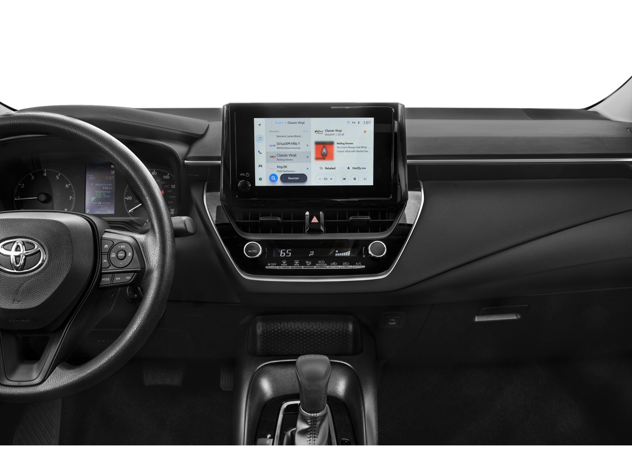 4-Wheel Disc Brakes, 6 Speakers, ABS brakes, Air Conditioning, AM/FM radio: SiriusXM, Apple CarPlay/Android Auto, Auto High-beam Headlights, Automatic temperature control, Brake assist, Delay-off headlights, Electronic Stability Control, Exterior Parking Camera Rear, Fabric Seat Trim, Front Bucket Seats, Low tire pressure warning, Panic alarm, Power steering, Power windows, Remote keyless entry, Speed control, Tachometer, Traction control, Bumpers: body-color, Driver door bin, Driver vanity mirror, Dual front impact airbags, Dual front side impact airbags, Emergency communication system: Safety Connect (up to 10-year trial subscription), Front anti-roll bar, Front Center Armrest, Front reading lights, Front wheel independent suspension, Fully automatic headlights, Illuminated entry, Knee airbag, Occupant sensing airbag, Outside temperature display, Overhead airbag, Passenger door bin, Passenger vanity mirror, Power door mirrors, Radio data system, Radio: 8 Toyota Audio Multimedia, Rear anti-roll bar, Rear seat center armrest, Rear side impact airbag, Rear window defroster, Split folding rear seat, Steering wheel mounted audio controls, Telescoping steering wheel, Tilt steering wheel, Trip computer, and Wheels: 16 Steel with Covers.